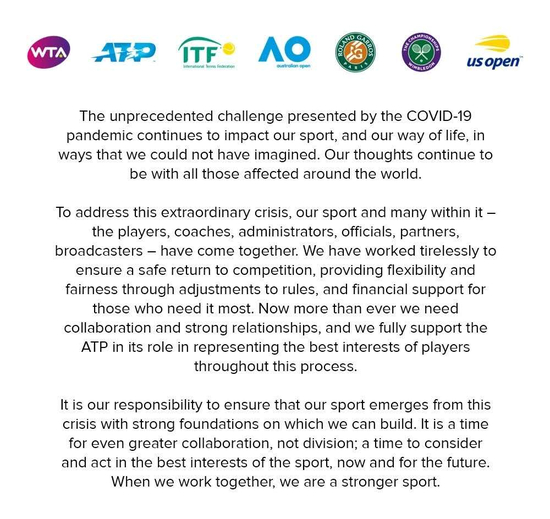 同时,WTA、ATP、ITF以及四大满贯共同设立了超过600万美元基金的援助项目,为约800名球员提供财务支持。