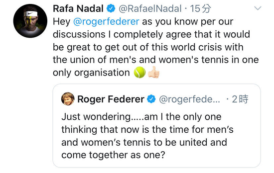 危机中也孕育着机遇。4月,费德勒在个人社交网络提议WTA和ATP两大组织可以借助疫情的时机联合起来,统一在一个组织之下。他的提议得到了纳达尔的转发认可,多位网坛名宿和球员也纷纷响应。