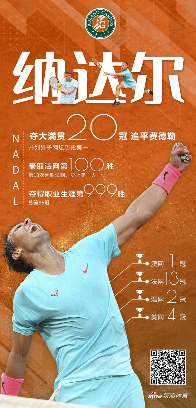 纳达尔夺得大满贯第20冠 追平费德勒并列史上第一