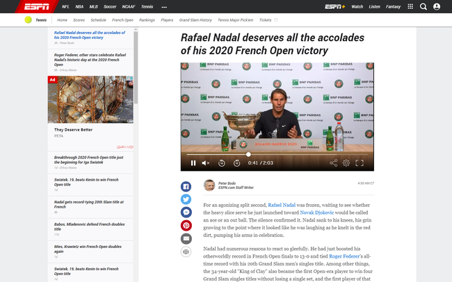 ESPN报道中称这场法网男单比赛应该是“纳达尔会一直铭记,而德约科维奇会竭力想要忘记”的一场。文章点评道,纳达尔以他标志性的“凶残”表现,横扫对手夺冠,并开创公开赛年代多项第一,除了20冠和法网13冠,还是首位在四大满贯都未失一盘夺冠的球员,也是50年来首位在30岁之后还拿下6冠的男球员。ESPN报道中还援引了名宿麦肯罗评价纳达尔的话:“我并不在意今年的场地有什么变化,拉法•纳达尔依然是目前世界史上厉害的红土球员。”
