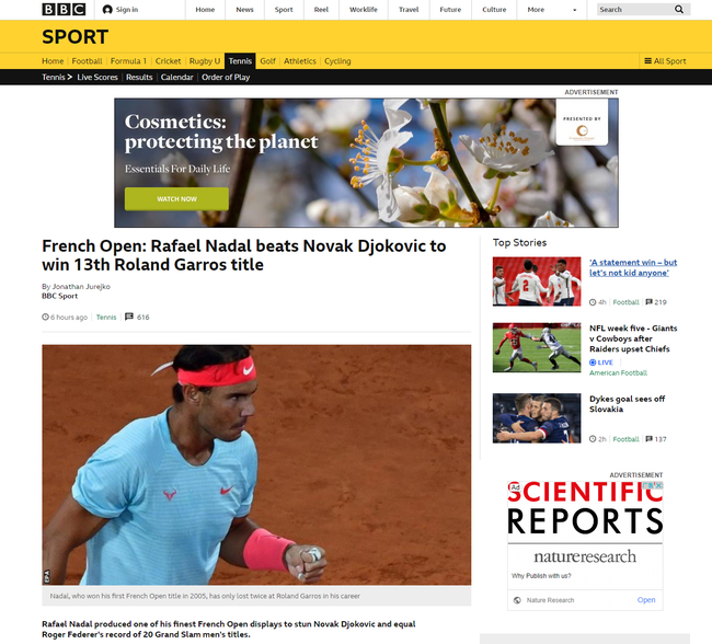 BBC撰文,纳达尔向世界证明,他为何能被称为“红土之王”。文章中写道:“过去15年来,体育世界里并没有多少事情能像纳达尔赢得法网冠军这样稳定。”文章中还列举了纳达尔本次夺冠所需要面对的挑战,包括疫情、场地、气温等因素。但“红土之王”一一克服了这些困难,不仅打出了未失一盘的表现,更重要的是以这样的方式在决赛中战胜了德约科维奇。BBC称赞纳达尔打出了“难以置信”的水准,在攻防两端都打出了极其“凶猛”的表现。