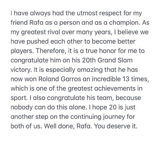 而作为一直被“cue到”的另一位在今天决赛场上“未露面的主人公”,费德勒却在赛后第一时间通过社交媒体向纳达尔送上了最诚挚的祝福和崇高的敬意。用他的话说:“希望20这个数字,都是我们新的起点!”