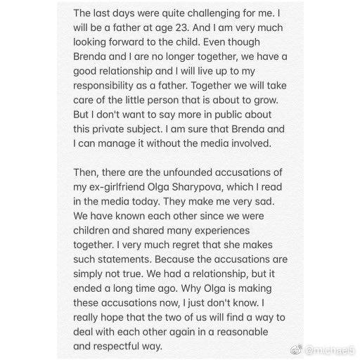 “过去两天对我来说过的很有挑战。23岁的我即将要成为父亲了,我非常期待孩子的到来。虽然我和Brenda已经没有在一起,但我们的关系依旧很好,我一定会尽到做父亲的责任,一起把这个小小人类照顾长大。不过关于这件私事我不想在公开场合谈太多,我觉得Brenda和我可以在没有媒体因素参杂的情况下,仍然处理好。