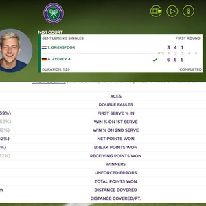 北京时间6月29日晚,2021温布尔登网球公开赛男单正赛首轮第二日继续进行。虽然其他比赛再次因雨暂停,但在有顶棚的1号球场,比赛照常进行。赛会4号种子、德国选手兹维列夫,仅用时1小时29分钟,就以6-3/6-4/6-1横扫荷兰选手格里科斯普,第5次打进温网男单正赛次轮。