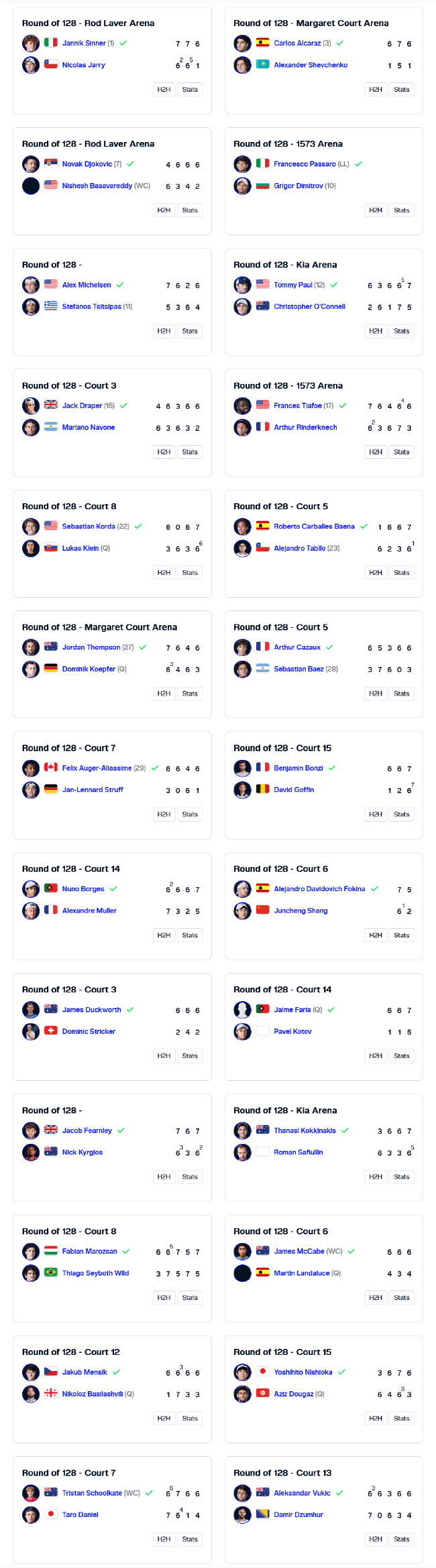 2025澳网公开赛正赛于当地时间1月12-26日在澳大利亚墨尔本举行。由于首日有多场比赛因雨取消,最终,第二比赛日男单共进行了26场比赛。