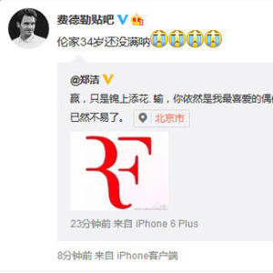 郑洁一直把费德勒视为偶像,也曾经说出最想和费德勒配对打一场混双比赛,今天瑞士人再次再冲击第18个大满贯的征程上折戟而归,郑洁也心生感慨,她发了新浪微博,说道:“赢,只是锦上添花. 输,你依然是我最喜爱的偶像。在35岁的年龄还保持如此高的竞争力。已然不易了。” 并配了一个费德勒的RF标志。
