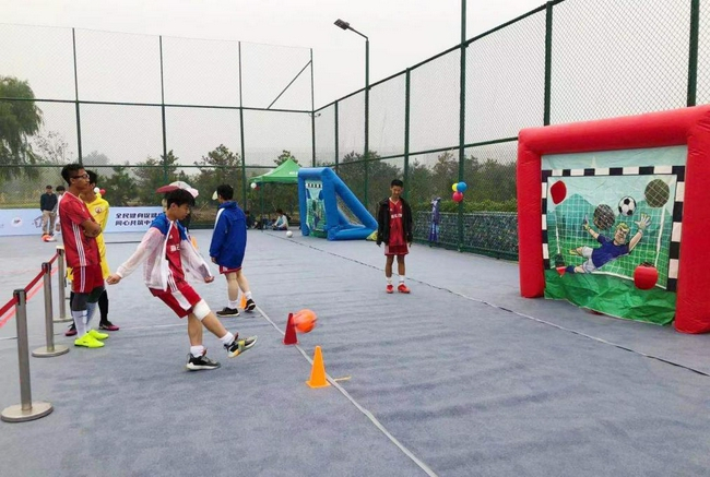 本次嘉年华活动共设置两个团体体验项目:众星捧月、旱地冰球;三个个人体验项目:兔兔跳、颠球绕桩接力、足球射门。项目设置既有团体项目,又有个人体验项目,兼顾足球训练的基本要求。众星捧月项目要求参与人员的配合能力和步调一致,对整个团队的要求较高。旱地冰球项目,则是要求队员配合默契,对于精准度和队员之间的协作能力有着很好的锻炼,这也是主办方让队员们在参与足球运动的同时,提前感受北京冬奥会的氛围。兔兔跳则是对队员个人的平衡和下肢力量的训练;颠球绕桩接力,是队员颠球的基本功的考验;足球射门是考验队员们射门的精准度。