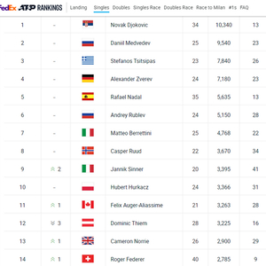 蒂姆下滑三位降至第12名,自2016年6月以来连续282周跻身前十行列的记录就此终结。费德勒上升一位,以2785分列第14名。