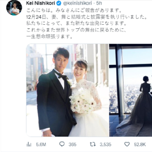 锦织圭在个人社交媒体写道:嗨,大家好,有件事要向大家报告,12月24日,我和妻子山内舞举行了婚礼和婚宴。对我们来说,这又是一个新的出发。为了重返巡回赛赛场,我会更加努力的!