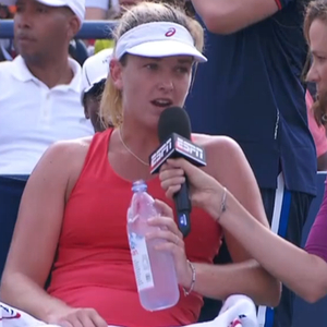 美网首轮比赛,本土球员范德维格挑战同胞29号种子斯蒂芬斯。在第一盘比赛战罢,盘间休息时,范德维格在休息座椅上接受了ESPN 35秒的采访。