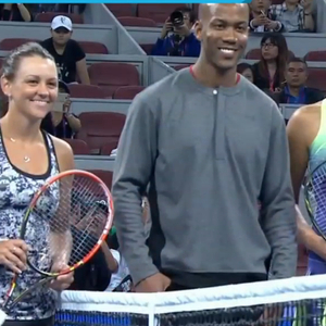 北京时间10月3日消息,CBA[微博]外援球员、篮球明星马布里[微博]为2015年中国网球公开赛钻石球场的揭幕战--塞尔维亚美女伊万诺维奇与澳洲好手德拉奎尔的比赛进行挑边,引发观众热烈欢呼。