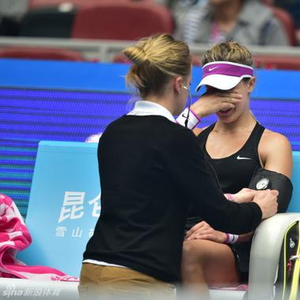 因美网期间在更衣室滑倒伤及头部,脑震荡的后遗症一直困扰着这位加拿大美女。中网首轮对阵13号种子佩特科维奇的比赛中,布沙尔在2-6输掉首盘,次盘进行至1-1时,突然叫了暂停,以手掩面,随即走回休息座椅,痛苦地用双手捂住面部,肩膀抽搐低声啜泣。赛会医生迅速入场对布沙尔进行询问、安慰以及医疗处理,加拿大姑娘的教练托马斯也是坐立不安,立即起身离开座位,焦急心情溢于言表。佩特科维奇见状也快步走到布沙尔身边,弯腰屈膝,十分担心地询问了具体情况,并亲切地拍拍加拿大姑娘的肩膀,以示安慰。