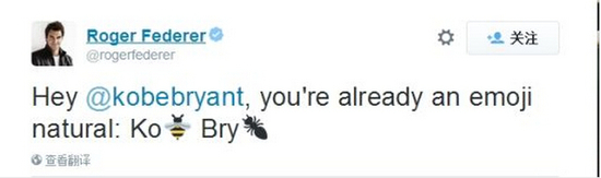 在去年7月份那场著名的推特表情大战中,费德勒发推调侃了科比的名字,“嗨!科比,你已经是一个天生的表情,Ko(蜜蜂的图案)Bry(蚂蚁的图案)。”“蜜蜂(Bee)”指科比名字里的“be”,蚂蚁则指的是“ant”。