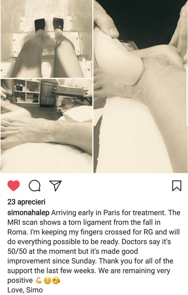 北京时间5月24日消息 在罗马女单决赛不慎扭伤脚踝的哈勒普在Instagram上公布了伤病情况,医生表示法网前完全恢复的可能性只有50%,不过罗马尼亚姑娘还是保持乐观的心态。