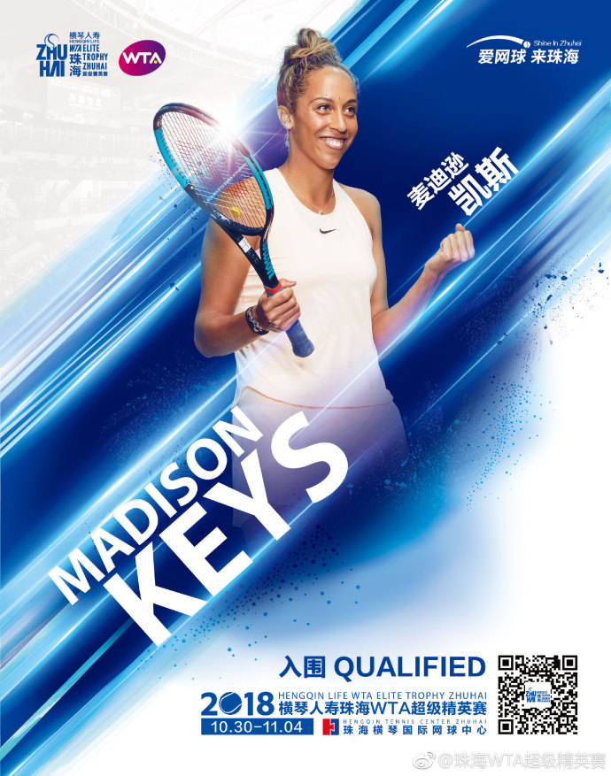 [2018年10月17日 珠海]随着亚洲赛季的结束,2018横琴人寿珠海WTA超级精英赛的入围球员阵容也逐渐清晰。北京时间10月16日,珠海WTA超级精英赛组委会宣布了首批入围的单打阵容——现世界排名18位的2017美网亚军麦迪逊·凯斯正式入围2018横琴人寿珠海WTA超级精英赛,加上此前入围的王蔷和格尔格斯,12个单打名额已锁定三席。其中,美国名将凯斯则是阔别三年重返珠海。