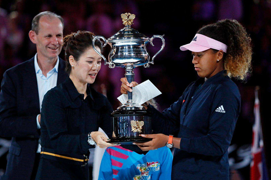 图说:2019年澳网决赛后,李娜为大坂直美颁奖 网络图