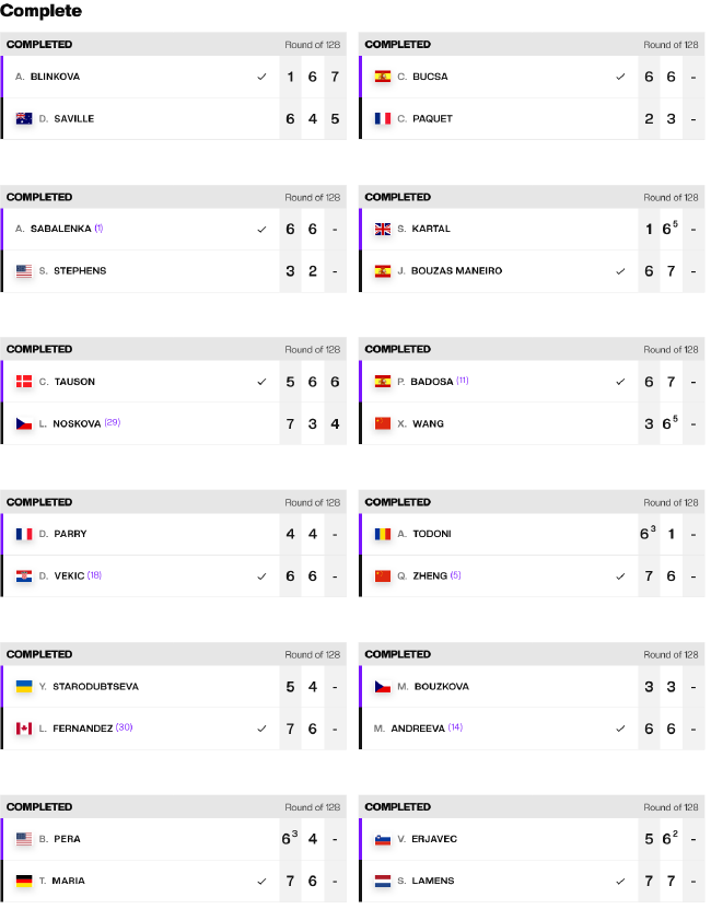 拉门斯以7-5/7-6(2)击败资格赛选手埃里亚韦茨,取得大满贯正赛首胜。玛利亚以7-6(3)/6-4淘汰佩拉,同样晋级次轮。年初在奥克兰捧杯的陶森,苦战三盘,在先输一盘的情况下,连扳两盘,以5-7/6-3/6-4逆转去年八强、29号种子诺斯科娃,接下来将对阵玛利亚。