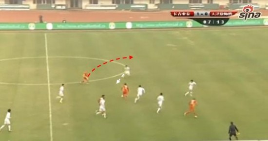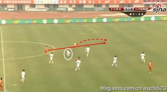 第8分钟,长春亚泰中场右路组织进攻,张文钊向中路移动后送出直塞,雷泽克左脚推射远角将比分扩大为2比0,如图3—7。