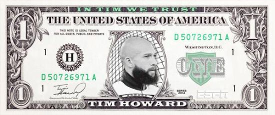 赛后,霍华德以16次扑救,当选全场最佳。他告诉ESPN:这只是我的工作,国家队付我工资就是让我干这个。而espn在官方推特上,把他p进1美元纸钞。