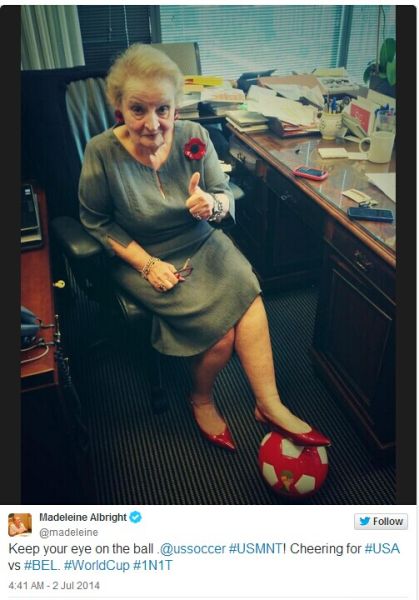 两位前国务卿,奥尔布赖特与赖斯,都在推特上发出支持的声音。77岁的奥尔布赖特,还发了张踩着足球的自拍照。