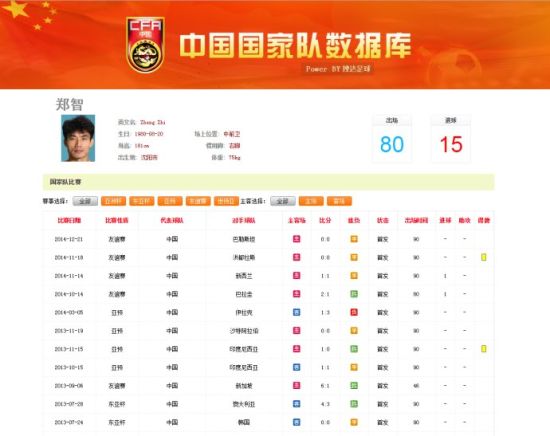 这里有中国国家队所有比赛的比赛数据,有中国国家队近20年来参加历届大赛和集训的大名单,有每一位国脚为国出战的出场记录。做国足球迷,晓国足数据,看国足比赛,为国足加油!