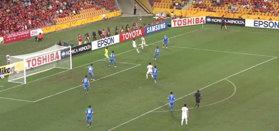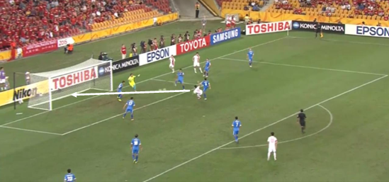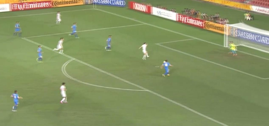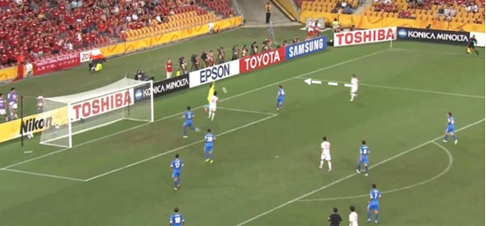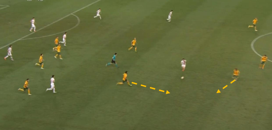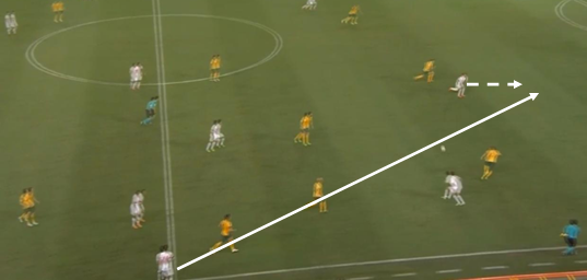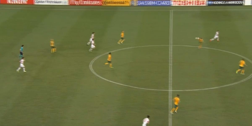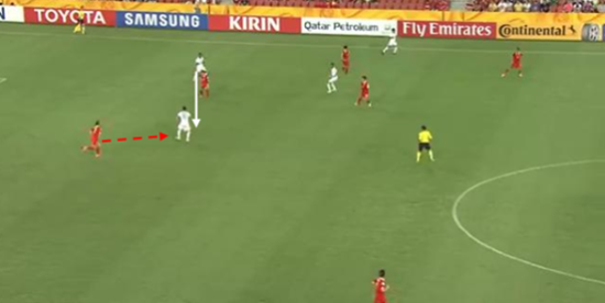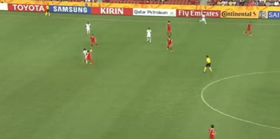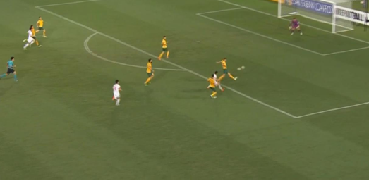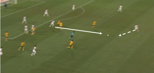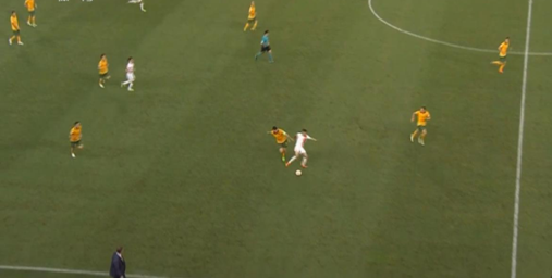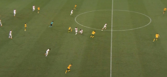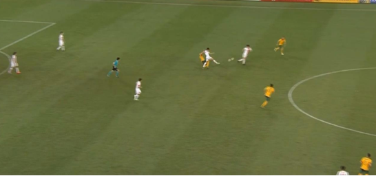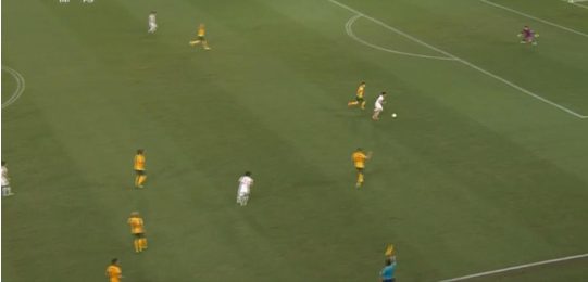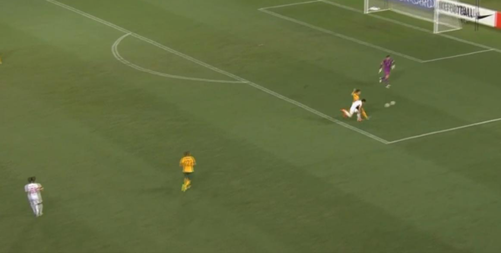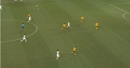 图24武磊被追上解析:这个球是否存在越位还有待商榷,不过图23,武磊领球转身时虽然领先半个身位,但随后马上被澳大利亚防守队员追上并破坏。即使没有被判为越位,这个球也无法形成威胁。假设一下,这个球要是在中超赛场上,武磊领先半个身位的情况下很可能就形成突破了,但到了国际赛场上特别是面对对抗能力更强的澳大利亚时,我们对抗中处理球能力不强的弱点就暴露出来了。