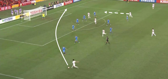 另外一次武磊有可能获得前插的机会是上半时第39分钟,郑智断球后挑传武磊但被对方空中拦下,如图25—26。