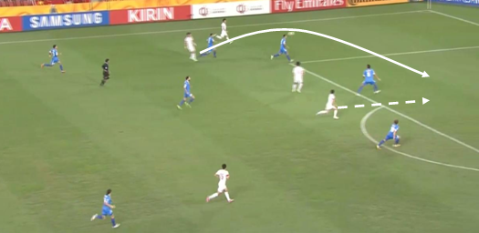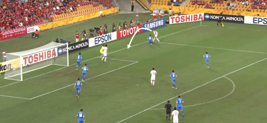 三、同伴的传球质量不高,武磊无法获得更多空切的机会。印象中唯一的一次属于而且适合武磊方式的进攻出现在对乌兹别克斯坦一战的第5分钟,于海在左路拿球,武磊中路高速插上,于海高质量的斜线过顶传入罚球区,可惜武磊稍稍慢了一小步,没有够到皮球,否则会是一次绝好的破门机会,如图27—29。