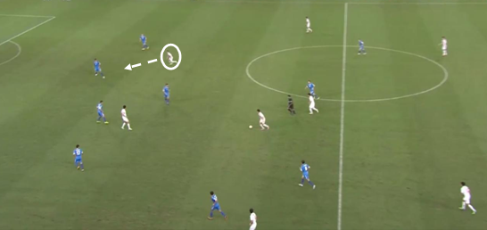 首先,还是想对武磊的表现进行一番肯定。首场对沙特的比赛,武磊在进攻端没有获得太多的表现机会,但在丢球后的反抢方面做得却是最为出色的。第21分钟和第40分钟,武磊有两次前场的积极抢断,如图1—4。