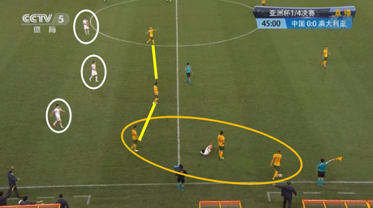 图18武磊失去控球权解析:虽然这个球最终判给了中国队界外球,但武磊在倒地的区域深陷对方的三人合围。同时,澳大利亚队的中场已经回防并组织好防守屏障,而中国队的三名中场队员则没有一个人能对武磊形成支援。