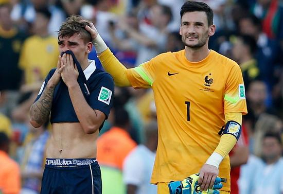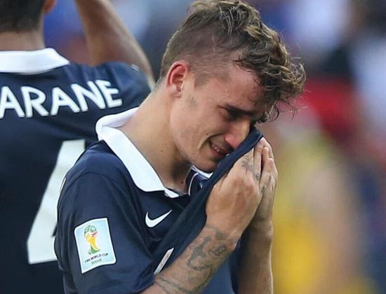 2014世界杯,法国1/4决赛输给德国,首发的格列兹曼哭倒在队友怀里。