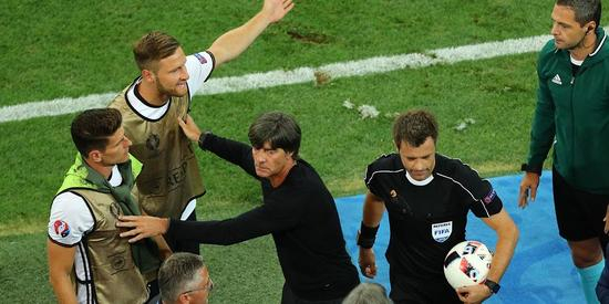 德国领队、20年前德国队夺得欧洲杯的逆转英雄比埃尔霍夫,第一时间向法国队表示了祝贺。他同样没有谈及裁判。