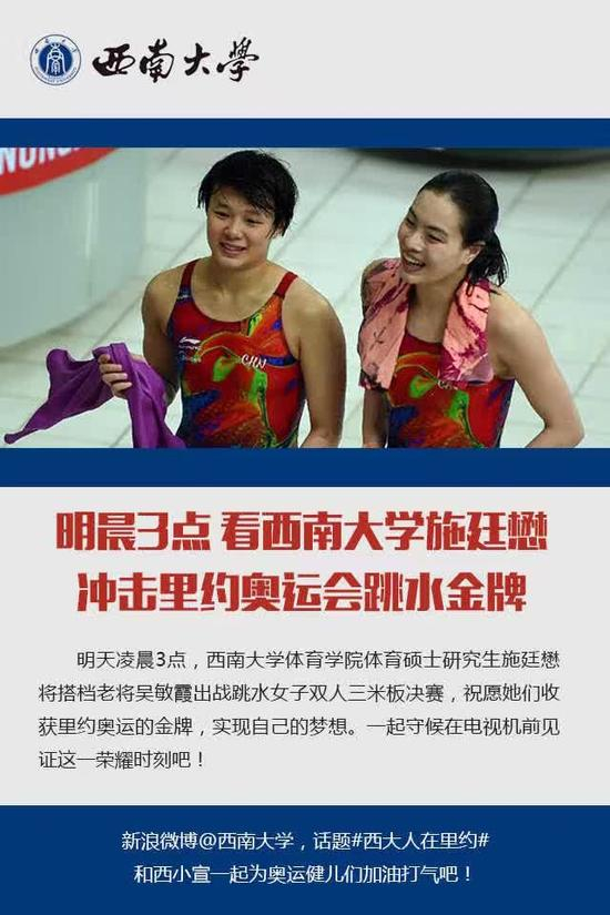 本届里约奥运会重庆西南大学体育学院运动系有五名运动员代表中国奥运代表团参加比赛,其中2013级运动系硕士研究生施廷懋夺取了里约奥运会女子三米板双人金牌,创造了重庆人第一块奥运金牌的崭新历史;随后施廷懋又在女子三米板个人获得金牌,是本届奥运会少数几个在里约奥运会夺取双金的运动员!
