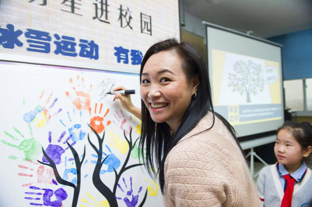 解说工作下午5点开始,但中午十一点,还饥肠辘辘的还需要驱车赶往据此25公里的首都师范大学附属朝阳实验小学翠成南校区。周五首都糟糕的交通状况,浓烈的雾霾天,都无法阻挡这位花游女神前进的步伐,因为她答应了为学校近1000余名小学生带来一堂冬奥知识小课堂。承诺了一定要做到,哪怕是下刀子,这是她多年职业历练的人生信条。