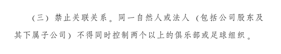 根据中国足协今年10月颁布的《中国足球协会职业足球俱乐部转让规定》:重要股权转让以及俱乐部之间是否存在关联关系将根据实质重于形式的原则进行认定。《中国足球协会章程》第十九条第(三)项规定:“同一自然人或法人(包括公司股东及其下属子公司)不得同时控制两个以上的俱乐部或足球组织”。