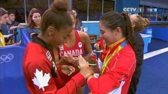 一年前,何姿和秦凯,在里约上演的“世纪求婚”感动了全世界,在何姿激动、害羞的神情中,参加这场决赛的意大利的卡格诺托,加拿大的阿贝尔等,都来跟何姿一一拥抱。阿贝尔更是拿起何姿的手,端详起了秦凯送的戒指,脸上都洋溢着幸福之情。