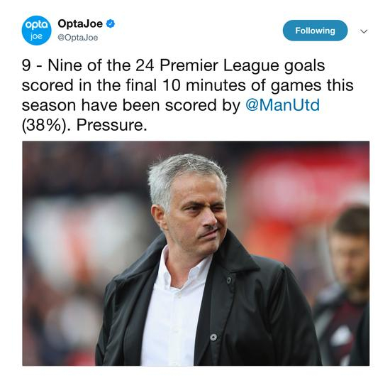 这5次平局中[斯托克城、阿森纳、埃弗顿、伯恩茅斯和斯旺西],4次丢球出现在第79分钟之后。本场拖进最后10分钟还是1:0,很多曼联球迷会有不祥的预感,尤其对方阵中有斯旺西旧将西古德森。