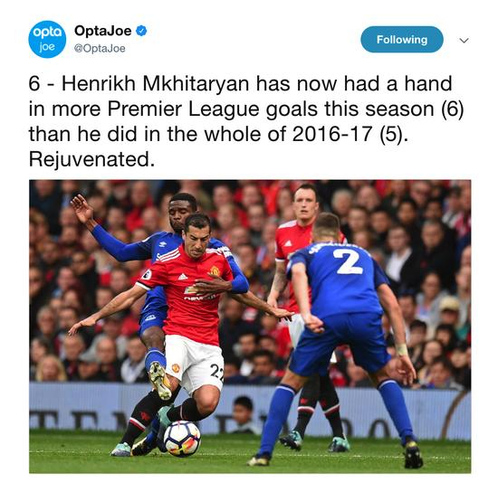 马塔已多场比赛赠乏笼鹅,既不能创造机会,也把握不住机会,却始终有首发,令人不解。姆希塔良进了球,为前场策划进攻的核心,也未能给曼联的攻势带来新意和惊喜。他和马塔,同属创造型球员,却像两个陌生人各芸其田。对比曼城的德布劳内和大卫席尔瓦,心有灵犀,张弛有道,曼联的前场搭配远未达到预期的效果。