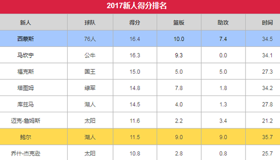 到目前为止,马坎宁平均每场出手三分球会超过7次,命中超过3个,命中率超过45%。他和西蒙斯是仅有的每场得分都上两位数的新人。