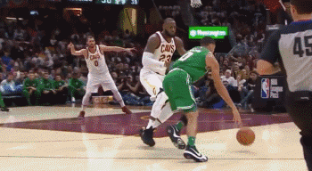 在我列出的五位最突出的新人中,塔图姆和西蒙斯都是身体、技术、意识准备得非常充分的,他们完全做好了打NBA职业比赛的准备,既插即用。对骑士那场比赛,下面第一张图可以看出他已经向詹姆斯宣示了自己的身体和力量,而五年前他还是一个向詹姆斯讨合影、在推特上求回复的小孩。