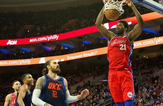 经过三次加时大战,76人队被威少一记助攻打败,罗伯森就在恩比德的眼皮底下上篮得分。