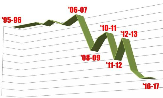 上面是我做的八一队参加职业联赛22年的成绩走势图,触目惊心。他们最后一次夺冠是在2007年,大郅归来后的第一个赛季。从那以后,战绩一路下滑,虽然有过两次反弹,但从2013-14赛季列第17名开始,接下来两年都是倒数第二,上赛季跌至榜末。