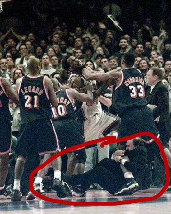 纽约尼克斯和热火发生群殴,范甘迪死死抱住莫宁大腿。这一幕也成为NBA经典。