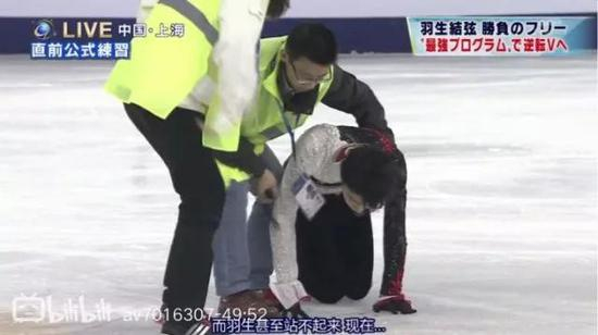 羽生结弦平躺在滑冰场上,无法动弹。当他被救援队扶出滑冰场时,他的下巴流着血,额角也有一道伤疤。一位当时在现场的同事说,那是“肉眼可见的血混着汗”。