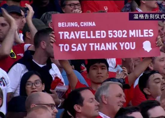 温格告别战,中国球迷如约到场,他们举起标语,向温格表最后一次白。