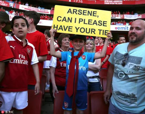 他的标语成功吸引了绕场致敬球迷的温格,法国老人缓缓解下熟悉的红色领带,送给了小球迷。