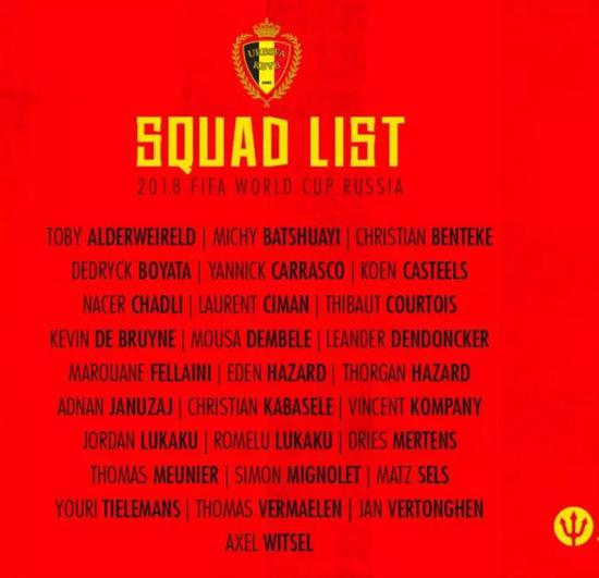 比利时队公布的是参加2018世界杯的28人初选名单: