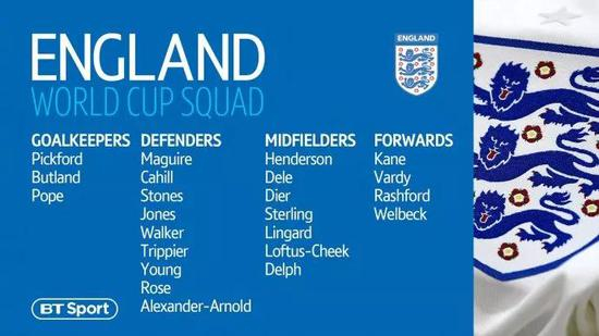 英格兰队公布的是参加2018世界杯的23人名单:
