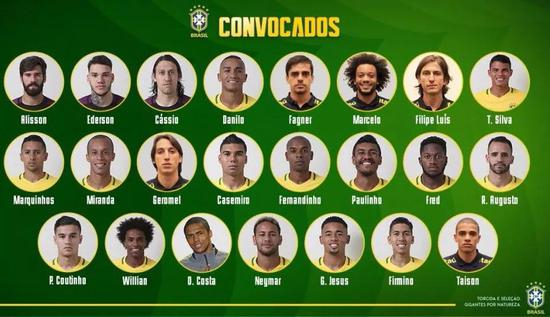 巴西队已公布参加世界杯的23人名单: