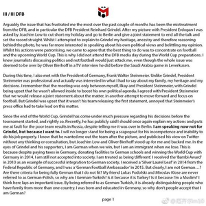 霍内斯和马特乌斯很机警,言辞激烈,但只是在批评厄齐尔足球表现在下降。然而退出事件,早就超出了足球含义。厄齐尔自己的讲述里,明确表示他5月和埃尔多安总统的合影,不带有任何政治意味,但这种说辞,德国社会大多数人是无法接受的——他们对于埃尔多安的政治立场极其反感,土耳其和德国的双边关系也相当紧张。此外厄齐尔长时间不发声,更是授人以柄。